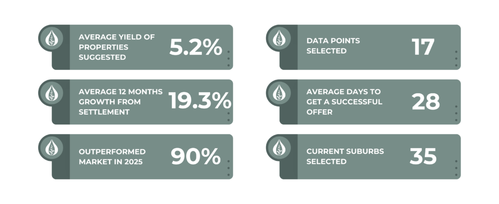 We only suggest properties we believe in. We are very particular with our selection of properties and suburbs. Every month, we reassess our suburb selection using 17 data points to source properties and only pick the best properties for our clients.